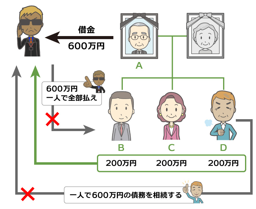 Aさんには600万円の債務がありました。この600万円の債務を、BCDさん3人の話し合いでDさん一人で600万円の債務を相続するという風に話し合ったとして、BCさんは債権者からの請求を拒むことはできるでしょうか。