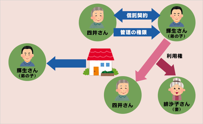 民事信託を利用すれば、四ツ橋さんは自宅を拓さんに利用させ、拓さん亡き後は一哉さんに利用させるということが可能となります。
